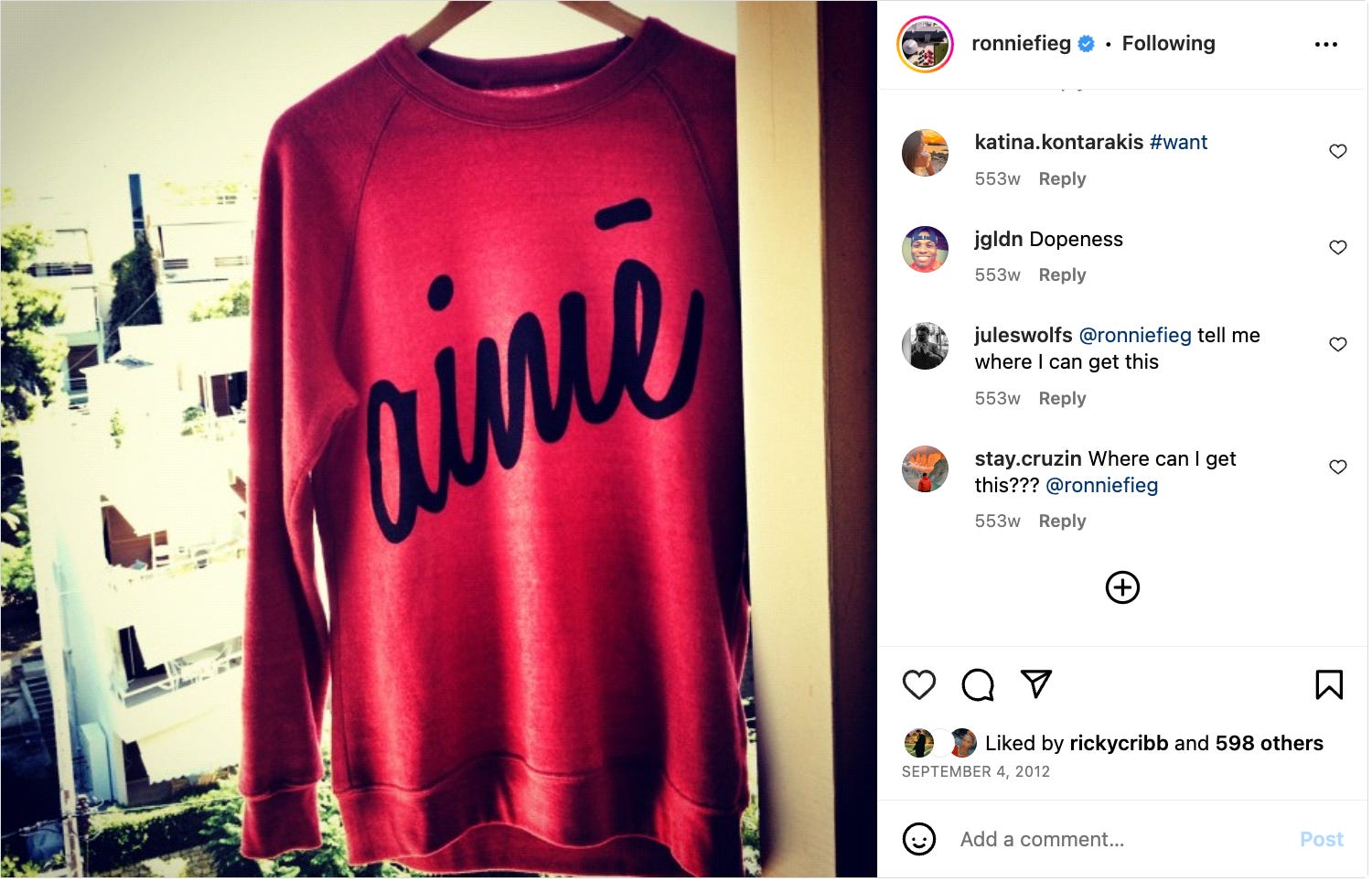 At the time, he formed a friendship with Ronnie Fieg (the owner of Kith) who was fast becoming one of the more commercially influential people in sneakers. Teddy and Ronnie were on a trip together in Paris when Teddy showed Ronnie his idea for the menswear brand. Ronnie posted a photo of an early Aime sweatshirt to his large instagram following. And said to Teddy “if this gets 500 likes, you know for certain he has something special on his hands.”