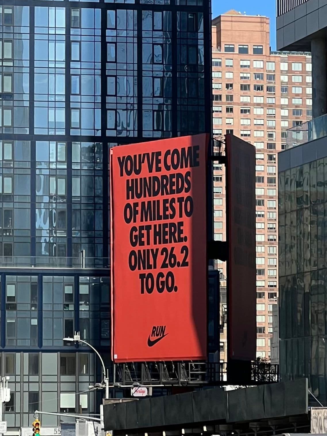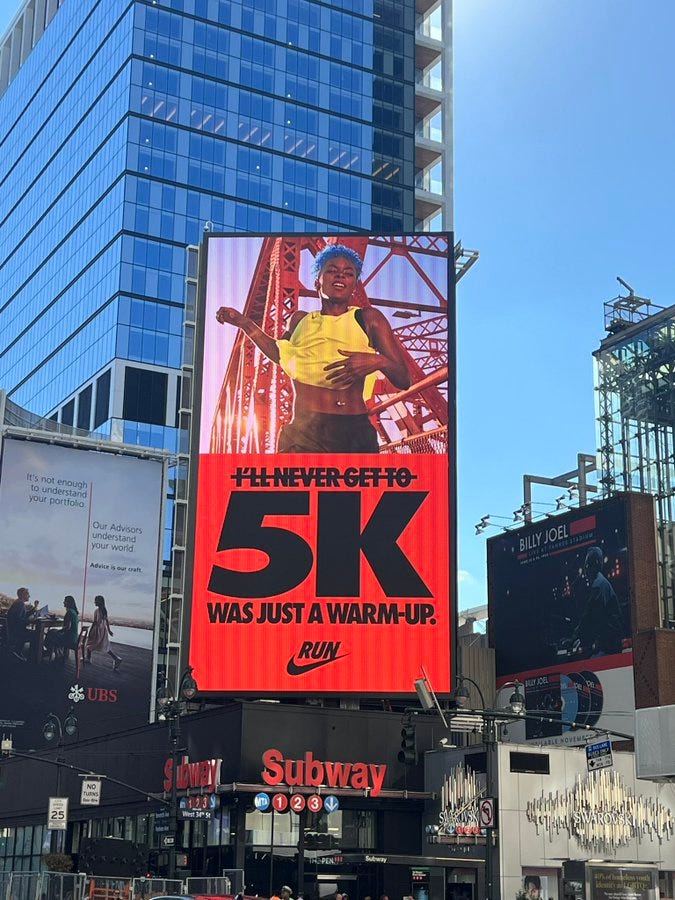 Throughout the marathon, Nike had countless billboards scattered across New York City. Not one of these featured products. Instead, they leveraged a bold design system (the same one they've employed since the Olympics and other marathons around the world) and spoke directly to the more than 50,000 runners registered to tackle the 26 miles. By doing this, Nike addressed their core audience: athletes. Remember their mission statement? While this is still a large group, it’s important to note that 8.25 million people live in NYC. As the old branding saying goes, "If you’re talking to everyone, you’re talking to no one." Nike understands this better than most.